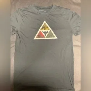 Dark gray tee with a bold triangular graphic. Features a unique design for a modern look. Ideal for everyday wear.