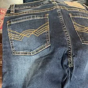Stylish blue jeans with unique embellishments. Perfect for a chic, casual look.