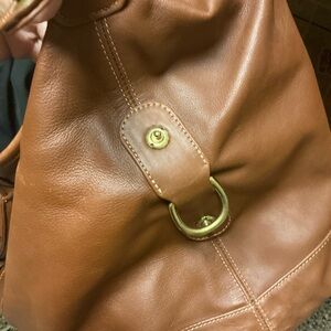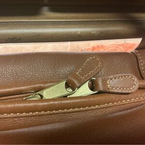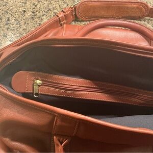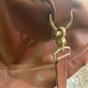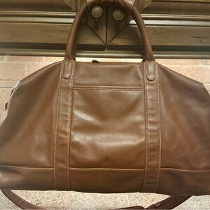 Stylish and durable brown leather travel bag. Perfect for weekend getaways or business trips. 100% leather with solid brass hardware. Very minor signs of wear to exterior. The hardware remains bright. Interior has two zippered side pockets. The lining is black canvas material and is in perfect condition. The bag measures 22” inches length, 9” wide and can be up to 11” inches height when the side gusset is unsnapped. See photos for all details. Includes adjustable padded shoulder strap.
