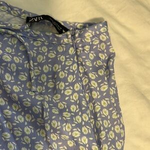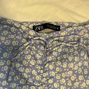 Zara two-piece skirt and top set, light blue floral. Includes a crop top and high waisted, front slit skirt with side zipper closure. Perfect for a date night, vacay or girls weekend. These crop top has button details and small ruffled trim and straps, with bodice like structure. The high waisted skirt has a faux bow with ruching that leads to a sexy slit. Skirt is size Small and top is size medium.