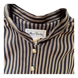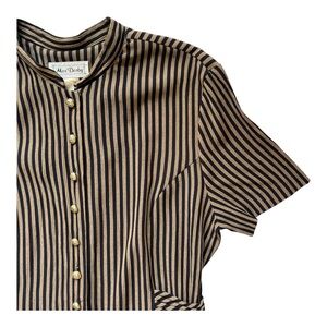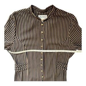 Miss Dorby vintage midi dress in black and tan woven fabric with an iconic 80s-inspired silhouette. Featuring a full button-front placket of ornate gold buttons, soft vertical striping for a lengthening effect, and tailored waist detailing, this piece offers the perfect mix of retro sophistication and wearability. The lightweight woven fabric drapes beautifully, moving with ease while maintaining its elegant structure. It’s a versatile vintage find with timeless charm.
