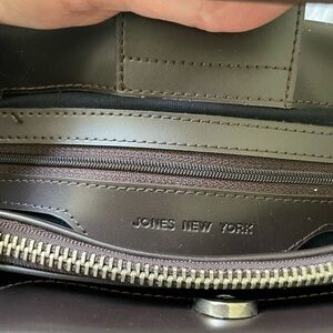 Jones New York olive green quilted purse with dark brown leather handles and bottom. Snap closure, 2 zip pockets and 2 regular pockets. Leather shows slight wear (pictured). Great condition! Length-10 1/2”, width-7”.