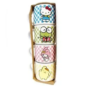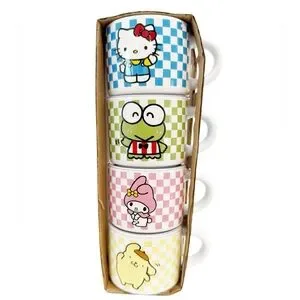 Set of four stackable mugs featuring Hello Kitty and friends. Colorful checkered designs in blue, green, pink, and yellow. Silver stand not included. New in box of 4.
