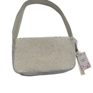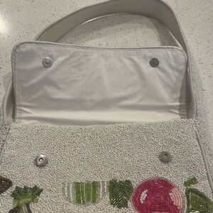 Beaded design, beaded shoulder strap, fully lined inside. 9.5 W x 6 H. Flap with magnetic close. 1 interior pocket