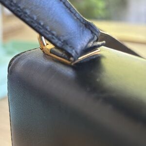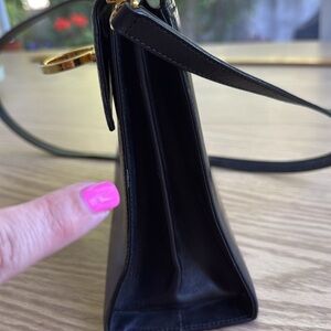 Salvatore Ferragamo Gancini leather 2-way Kelly shoulder bag. Beautiful black leather classic cut bag with top handle and shoulder strap. Expands and opens accordion style into two pockets, one with a zipper pocket inside. Gold hardware. This is stunning! The top handle is starting to loosen as shown. Minor scuffing as shown on bottom (I have not treated the leather to try to remove) - otherwise in excellent preloved condition. Very clean interior. Approximate measurements empty: depth 3.5”, height just over 7.5”, width at widest 7.75”, drop from handle 4”, shoulder drop 19.5”.