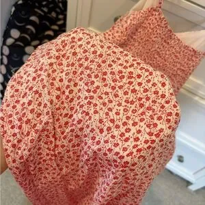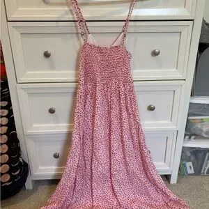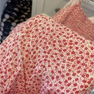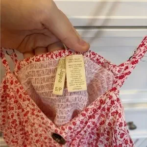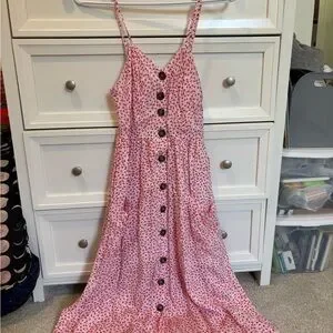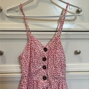 Stylish red floral dress with button details. Features delicate straps and a breezy fit.