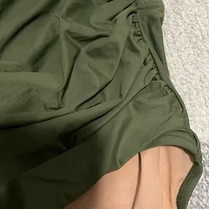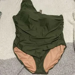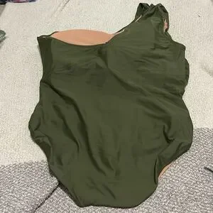 one piece swimsuit, one shoulder, ruched, removable pads, green