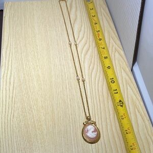 This elegant Avon gold and pink cameo pendant necklace is a timeless piece for any jewelry collection. The intricate design and classic gold color make it perfect for any occasion.