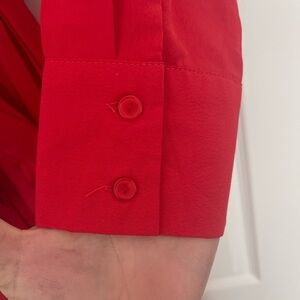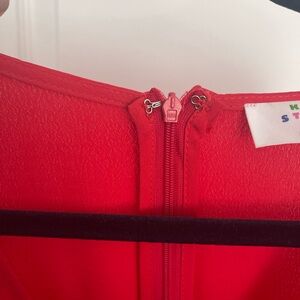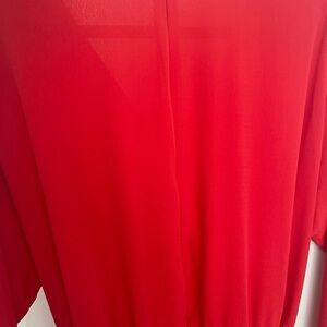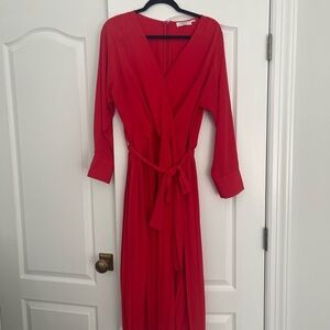 Pleated midi dress long sleeves with front slit and cross over bodice (has hook/eye closure at bust); zipper in back; removable belt