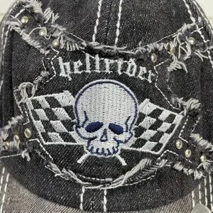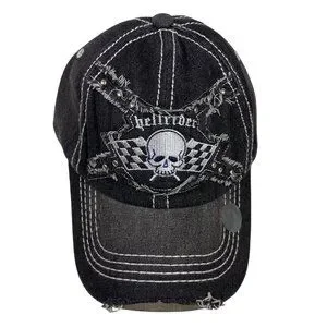 Distressed Black Baseball Cap With “Hellrider” Patch featuring a Skull and Checkered Flags.