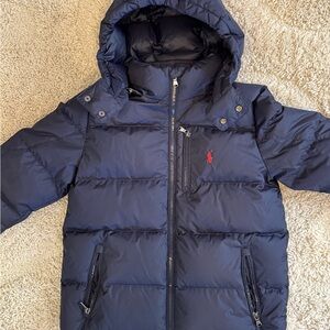Classic navy blue puffer jacket in excellent condition. Features red Polo Ralph Lauren symbol. Removable hood with optional snap closure to secure it under the chin. Three zippered pockets (no lost gloves!). Very warm and cozy. My son barely wore it before he outgrew it. Boys size 10-12.