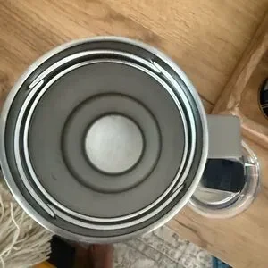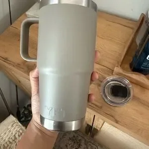 Durable YETI mug with handle. Sleek gray finish and stainless steel trim. 20oz