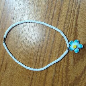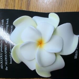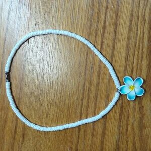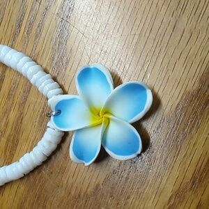 Puka shell necklace from Hawaii with blue Plumeria flower pendant. Worn a couple of times. Approximately 17" long with barrel clasp. Used. Plumeria flower hair clip is new. Please see all photos for personal judgement of condition.