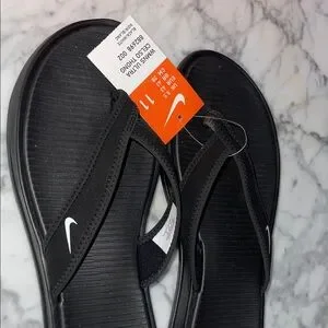 Sleek black flip flops with iconic Nike swoosh. Ideal for everyday comfort. Never before worn! The soles have a sparkly glitter finish that’s subtle and may be seen in the pictures as white spots.