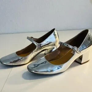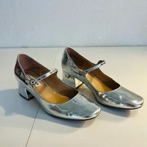 Shiny metallic heels with a classic Mary Jane strap. Stylish and comfortable for any event.