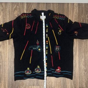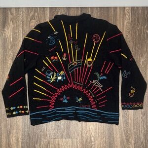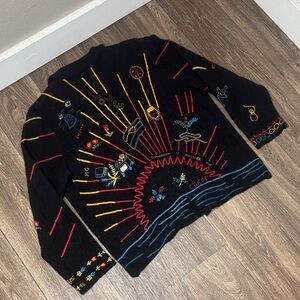 Stylish black cardigan with vibrant embroidery. Features unique patterns and colorful accents. Ideal for casual wear.