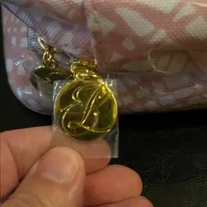 Front pocket with gold and pink zipper that goes around entire bag - so it can open flat.