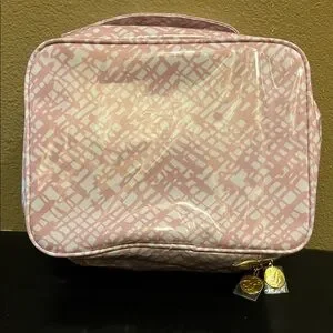 Chic Estee Lauder cosmetic bag. Pink and white pattern. Perfect for travel or daily use.