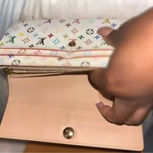 Chic Louis Vuitton clutch with vibrant monogram pattern. Features a white base with colorful accents. Ideal for a stylish touch. Preloved condition ful spots in certain compartments of wallets and scratching on the snap closure but other than use in EUC. The first drop of murakami over 20 years ago