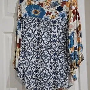 Chic floral blouse with button-up front, Features vibrant blue and yellow flowers, super cute with denim, size large, NWT
