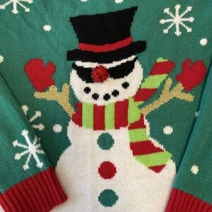 Blizzard Bay size Medium fun ugly Christmas sweater featuring an adorable sunglasses wearing Snowman with metallic pompom nose. Green is the base color with lots of white snowflakes and metallic gold. Machine wash- inside out. It has been depilled. Has a small snag, not raveling or pulled out. Could be just the way the machine did the knitting. See last picture. See photos for condition and measurements.
