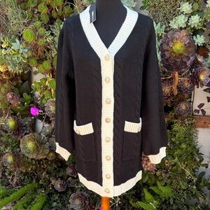 Chic black cardigan with cream accents. Features button-down front and pockets. Perfect for layering.