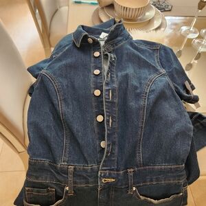 Chic blue denim jumpsuit with flare legs, short sleeves and button-up front, point collar, elastic waist bend on back, and front side pockets, back pockets. This design will keep you chic.