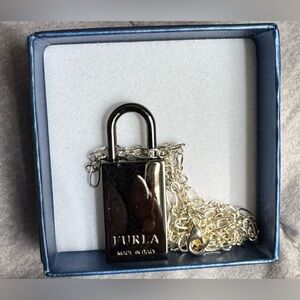 This is a Furla Candy Lock in silver, it is excellent condition without any issues. The lock features a prominent "F" emblem, which is the initial of the Furla brand on one side and the name and “made in Italy” on the other. I do not know if it opens. Never used. Includes a free chain to be used as a pendant.