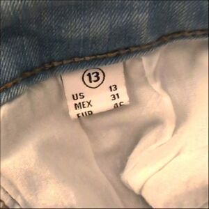 High-rise 5-pocket, skinny leg, distressed. One button closure, zip fly. Regular back pockets. Regular hem. Machine wash.