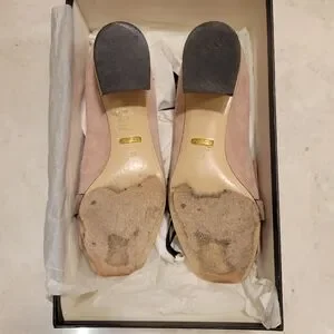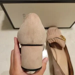 These stunning heels are crafted of pink suede kidskin leather and feature a 2.25-inch block heel with a large antique gold GG logo and fringe on the toe straps. Size 39, some slight wear on heels/insides shown in photos.