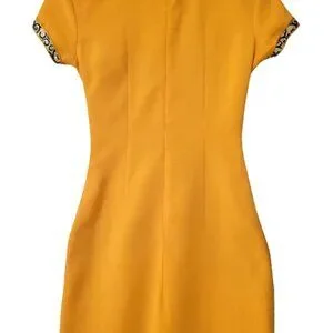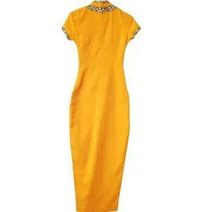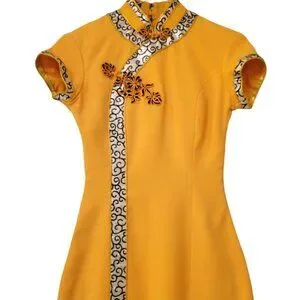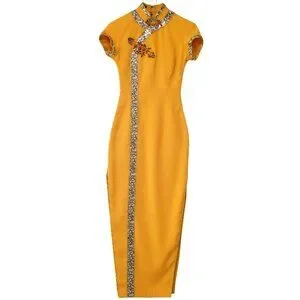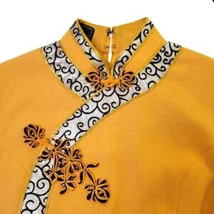 Turn heads in this radiant gold qipao dress, masterfully tailored in a luxurious crepe fabric that drapes the body with a sleek, structured elegance. The dress features a classic Mandarin collar and cap sleeves, both beautifully accented with silver-and-black brocade trim in an elegant swirl pattern for a regal touch.
