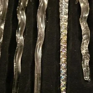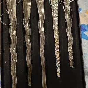 Beautiful set of 5 glass icicle ornaments. Ideal for festive decoration. Features clear and iridescent designs. Absolutely perfect condition!!!