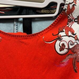 The Roberto Cavalli Midi Bodycon Dress is a stylish and versatile option for the modern business woman. Made with stretch fabric, this dress features a flattering bodycon style and a midi length, perfect for a professional yet chic look. The multicolor design adds a touch of personality to the outfit, while the zip closure ensures a secure fit. Main background color is a dark orange. Ideal for a size 6/8, this dress is sure to make a statement at any business casual event.