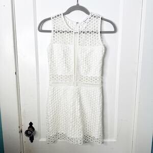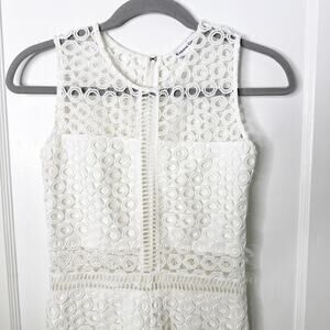 Karina Grimaldi Felix Crochet White Eyelet Jumpsuit Style 6407 Size XS Peekaboo. Good, preowned condition. Tank top and shorts style. White paneling at bustline and shorts. Waistline and in between bustiline has a peekaboo detail with no lining underneath crochet pattern. Zipper and hook and eye closure at back. Polyester. Dry clean.