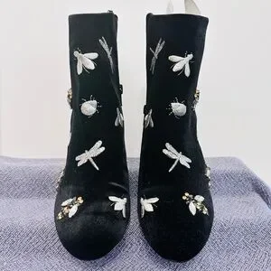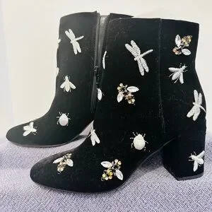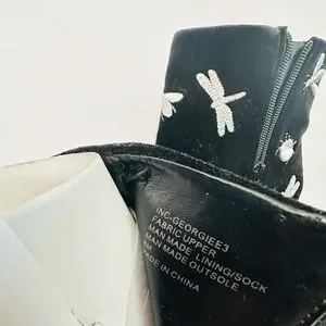 New, never been worn Dagon Fly black ankle boots with silver dragon flies & bees embroidery and rhinestones. Perfect for adding flair to any look.
