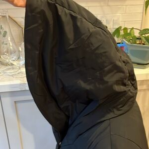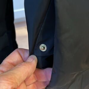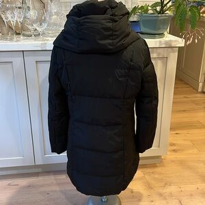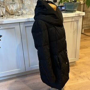 EUC Cole Haan down filled black high neck hooded collar zip & snap front close
