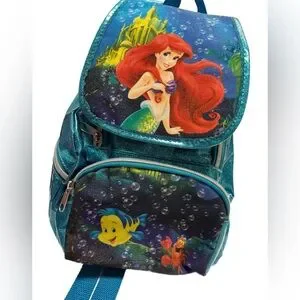 Enchanting Disney backpack with Ariel, Flounder, and Sebastian. Glittery teal design. Perfect for kids.
