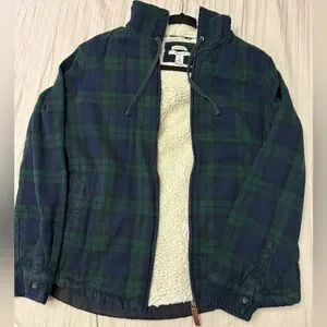 Cozy plaid jacket with soft sherpa lining. Ideal for cold weather.