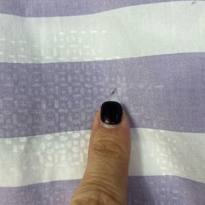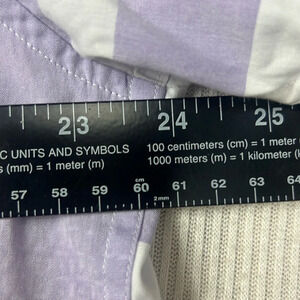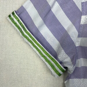 Purple and white stripes with contrasting sleeves when cuffed (see pic). Has an almost textured looking print to it as well