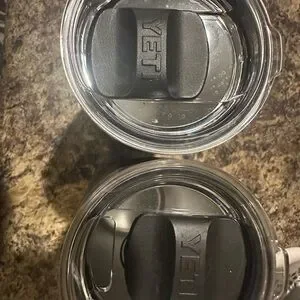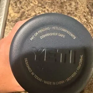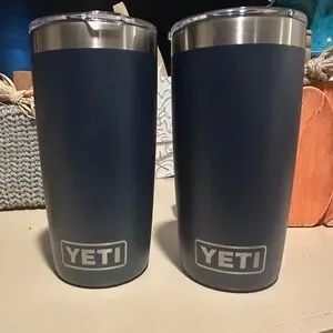 YETI tumbler in a sleek blue finish. Perfect for keeping drinks hot or cold. 10 oz