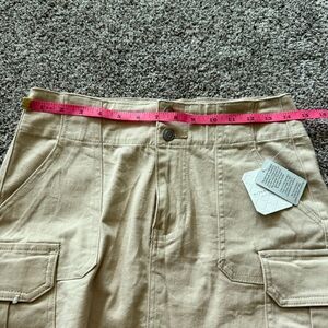 Brand new skirt. Tags still attached. Khaki/tan and color. Two buttons and a zipper. Pockets. Smoke-free home. Retail value $64.