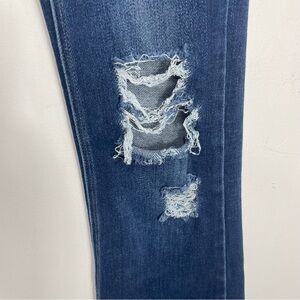 Trendy dark blue jeans with a flared leg. Features stylish distressed details. Ideal for casual wear.