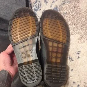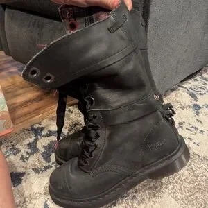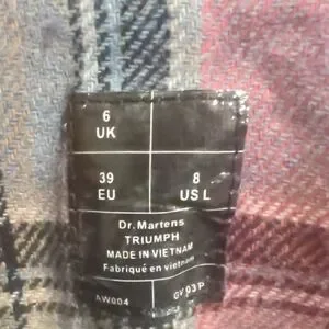 New without tags, never worn Doc Marten triumph boots. combat boot, dark gray leather, pink and gray plaid interior. you can wear them tall or fold them over.