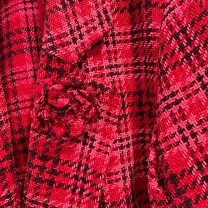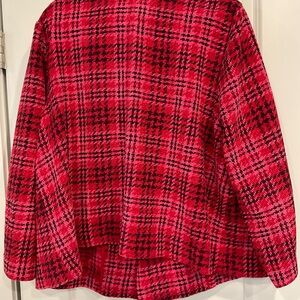 Chic tweed blazer/jacket with a stylish design. Red with hints of pink and black Perfect for layering and adding flair. Removable flower. No button closure