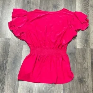 Elegant blouse with ruffled sleeves. Smocked waist enhances fit. Perfect for any occasion.