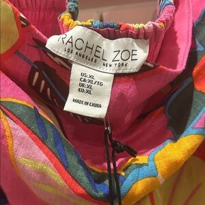Chic strapless dress with bold floral design. Features pink and yellow tones.