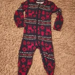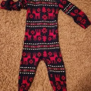 Charming one piece with playful red patterns on navy. Soft and snug for all-day comfort.