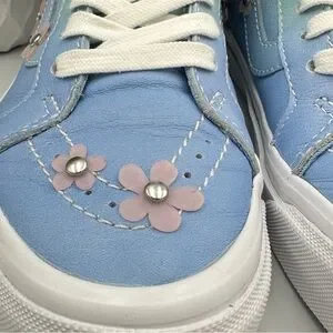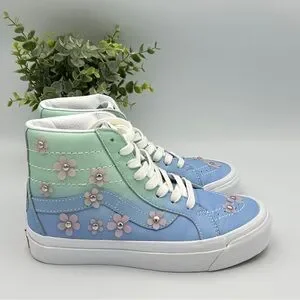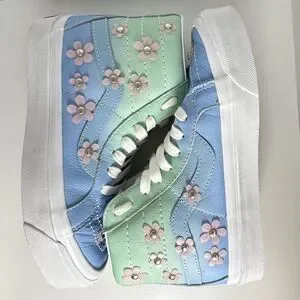 Stylish high-top sneakers with floral accents. Features a blue and green color scheme.