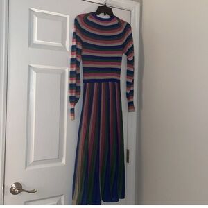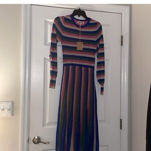Chic long sleeve dress with vibrant stripes. Features a mix of purple, blue, and pink. Perfect for a bold statement.