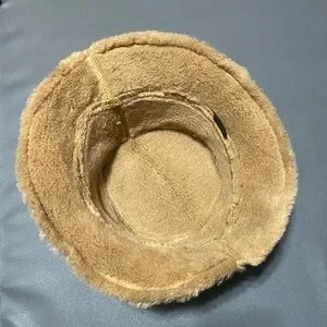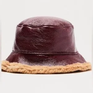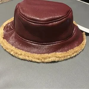 Elevate your style with this chic burgundy leather bucket hat. Featuring a luxurious faux fur trim, it's perfect for adding a touch of elegance to any outfit.